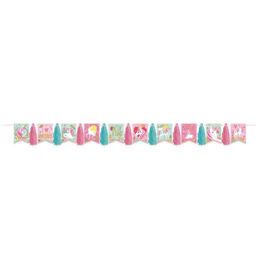 En stilfuld krans med Unicorn-motiver, der er perfekt at hænge til næste fødselsdagsfest for dem, der ønsker en fræk dekoration!