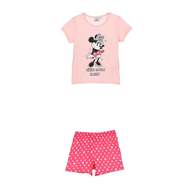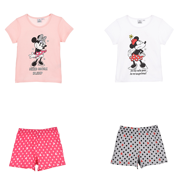 Køb Minnie Mouse -shorts og en kortærmet t-shirt, der også kan bruges som pyjamas. T-shirten er afbildet med Minnie Mouse med en bue, og shortsen har prikker. Fås i lyserød eller hvid.