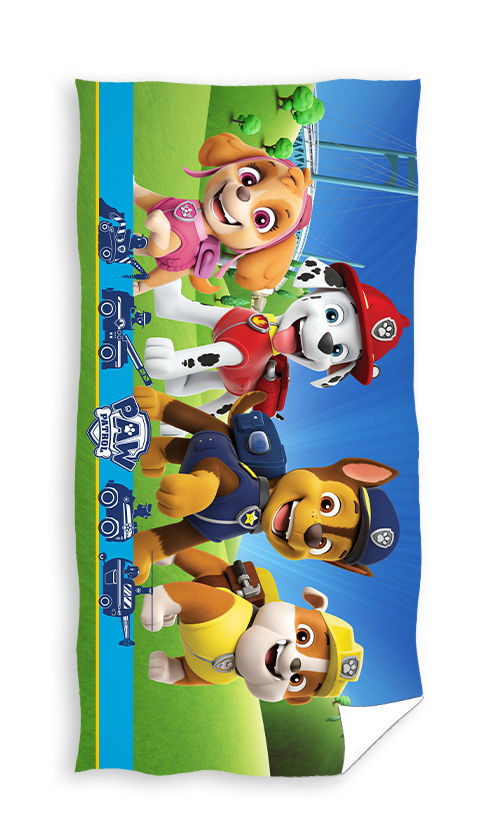 Et håndklæde med motiver på PAW Patrol-tegnene Skye, Rubble, Marshell, og Chase. Håndklædet kan bruges på stranden eller på andre badepladser. Størrelsen på håndklædet er 70x140 cm.