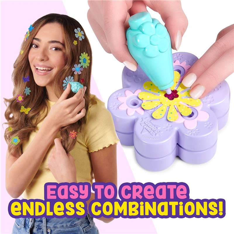 Vælg mellem 130+ blomster og pailletter for at skabe det perfekte look til at præge dit hår på få sekunder. Skab endeløse looks ved at lægge blomster og pailletter i lag for at matche din personlige stil!