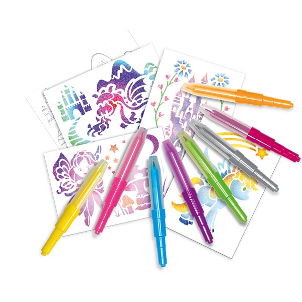 Blopens sæt med fantasy temaer, du kan lave de mest magiske tegninger med airbrush effekt. Udforsk og lav dit eget kunstværk, og lad din fantasi sætte grænserne.