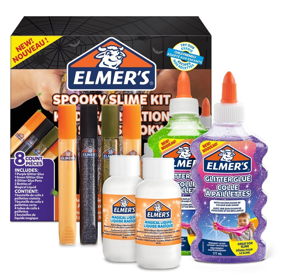 Elmers uhyggelige slim-kit er et sjovt håndværkssæt til dig, der ønsker at skabe glitrende slim i forskellige farver. Sættet indeholder glitterlim i forskellige farver, magiske væsker og glitterblyanter. Alt hvad du behøver for at skabe uhyggelig slim. Instruktioner til blanding findes på siden af pakken!