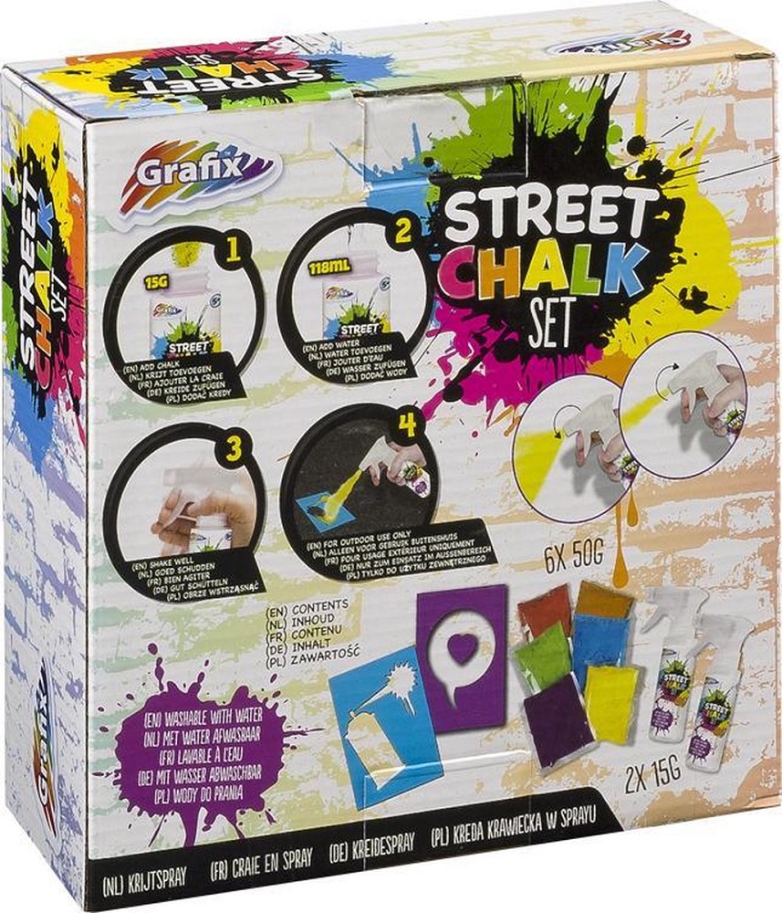 Fyld gaden eller indkørslen med nogle seje mønstre og farver med dette sprøjtesæt. Det er det samme som gade farveblyanter, men i stedet for farveblyanter blander du vand og toner i en flaske og tegner ved sprøjtning. bland 15 g pulver med 118 ml vand og ryst godt, så spray det bare på!