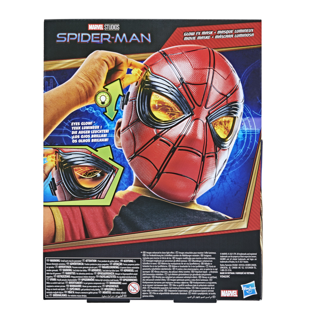 Masken er en kopi af Spidermans originale maske og har en elastikrem, der får den til at passe perfekt på alle børns hoveder! For at tænde lyset i øjnene skal du blot trække håndtaget ned på højre side af masken.