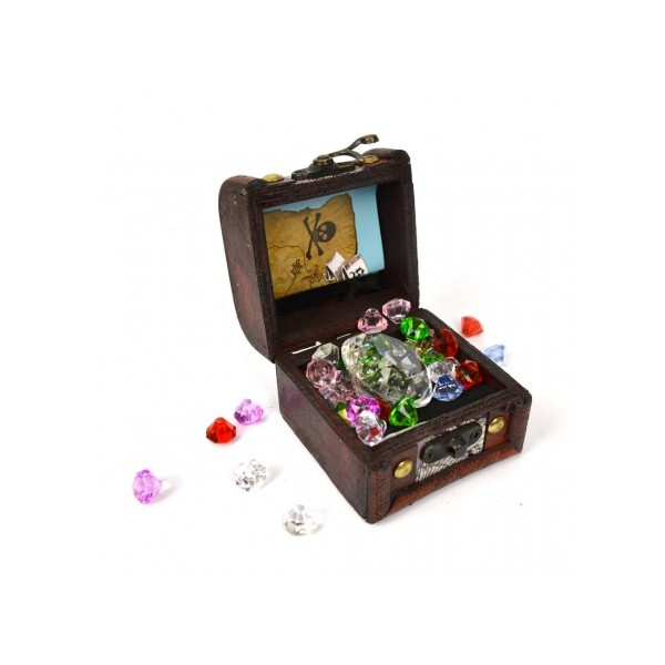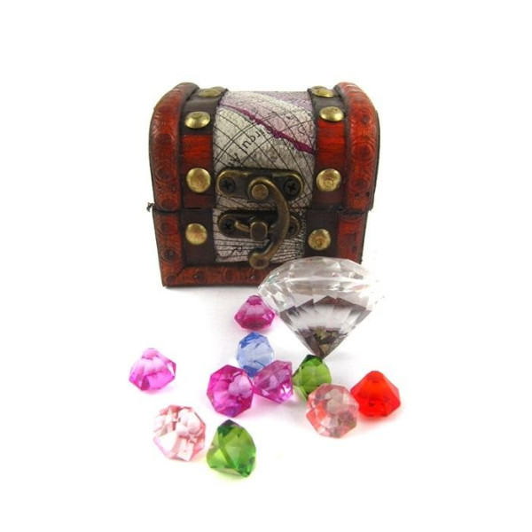 Tid til spændende skattejagt! Denne fine trækiste indeholder smukke diamanter i forskellige farver. Du får også et sjovt skattekort og en lille pose af fløjl. Skatkisten opmuntrer til sjov leg og passer perfekt til børnefester og andre arrangementer. Hvem lægger beslag på den eftertragtede skat? - Skatkiste med diamanter, skattekort og fløjlspose - 37 dele