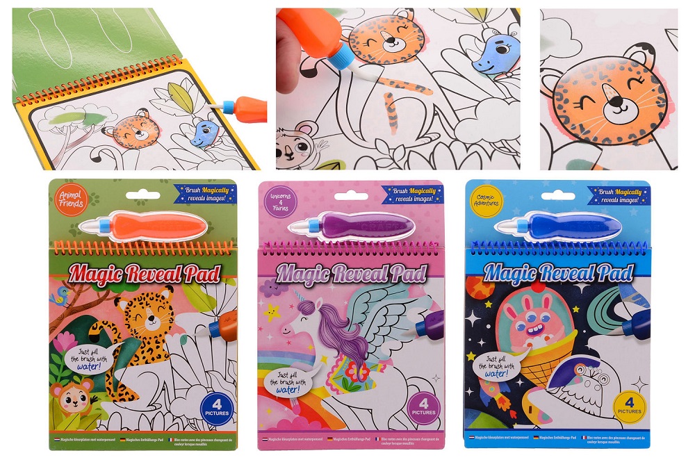 Denne spændende blok indeholder fire genbrugsbilledsider. Fyld bare pennen med vand for at farve hver sideoplysninger, og der vises levende farver med hvert penselstrøg.