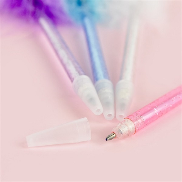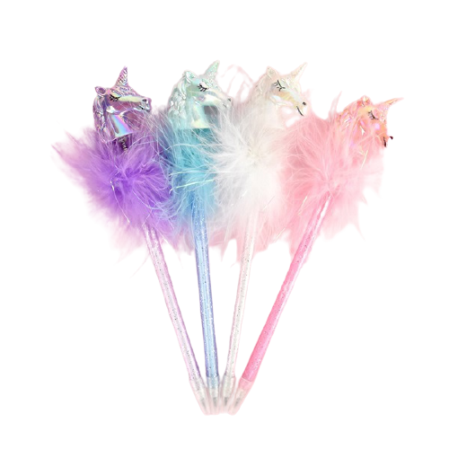 Enhjørningspenner har mange forskellige farver på fjer og hoved. Hovedet er fastgjort til en metalfjeder, så fagforeningen kan bevæge sig lidt! Penrammen er fyldt med forskellige farver glitter, men penblækket er som en almindelig blækpen.