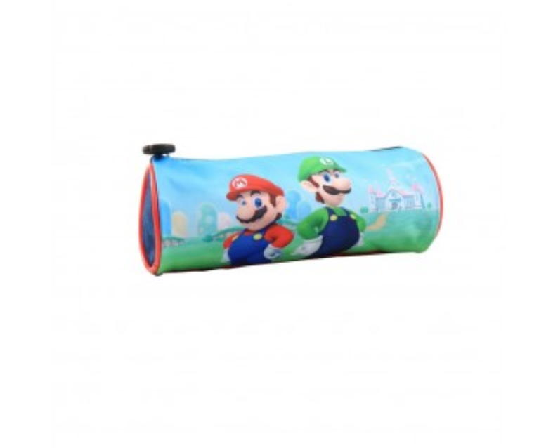 Et flot farverigt rødt penalhus med motiver på Super Mario & Luigi på forsiden og med teksten Supermario på bagsiden!