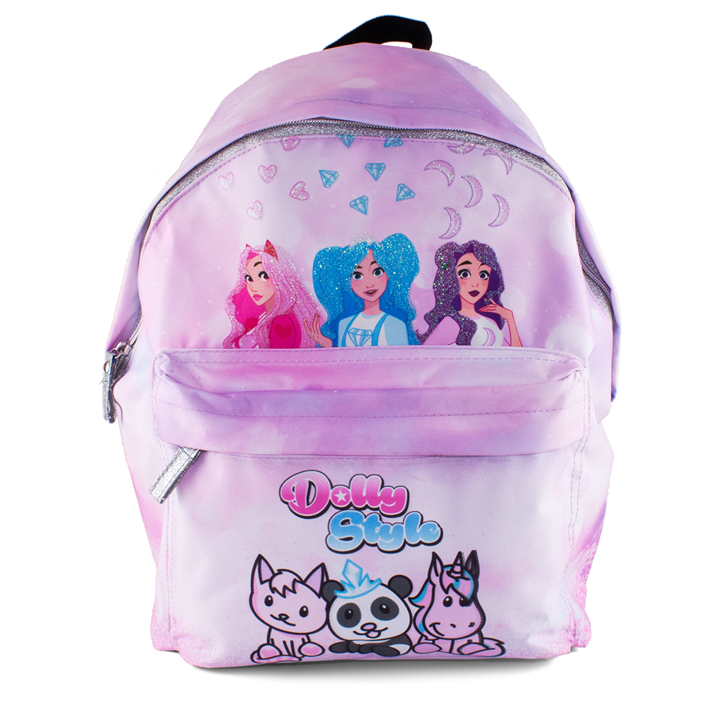 En fin rygsæk med design kendt fra Dolly Style Song Contest. Rygsækken har to stykker rum med lynlås. En større rum, hvor dit barn kan gemme større ting A4 pad og et lille rum, hvor blandt andet A5 pad og markører passer. Stropperne af rygsækken kan tilpasses til de fleste børn skal kunne bære det på ryggen.