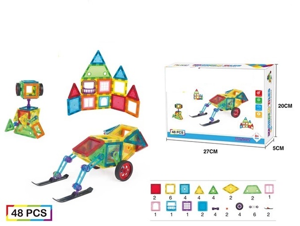 Dette sæt fremmer opfindsomhed og kreativitet! Det består af 48 magnetplader, der kan sættes sammen på forskellige måder. Pladerne har forskellige farver og former og kan bruges til at skabe en række spændende strukturer. Sættet giver kendskab til symmetri og geometri og hjælper med at udvikle finmotorik. - Byggesæt med 48 magnetplader