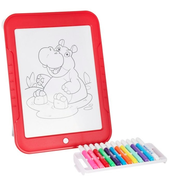 Lad børnene bestemme over deres egne motiver og male frit eller bruge en af ​​de medfølgende 42 stenciler, der repræsenterer blandt andet bogstaver, spil og kunst. Når det er tid til at starte forfra, skal du bare tørre med den medfølgende klud og male igen og igen! Tavlen kan også bruges som natlampe. Placer bare pladen på den medfølgende støtte eller fastgør den med sugekopperne.