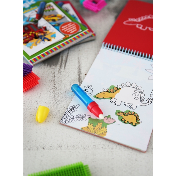 Wild Coloring Book Water Magic Dinosaurs er en magisk farvebog, der kan genbruges. Malebogen har seks forskellige motiver med junglens fine dyr. Fyld pennen med vand og mal på et af de forskellige billeder, så forskellige farver og motiver vises. Når vandet tørrer, bliver alt hvidt igen, og det er muligt at male igen. En super hård farvebog, der giver mange sjove timer!