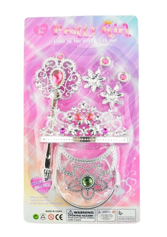 Dette sæt har alt, hvad en prinsesse behøver! Det indeholder i alt 5 dele med glitrende stil og flot design. Du finder for eksempel fine øreringe og skinnende tiara. Kongelig glans i overflod! Sættet er perfekt til sjov leg samt til fester og arrangementer. - Indeholder 5 dele Produktinformation: Mål: 35 cm Anbefalet alder: Fra 3 år