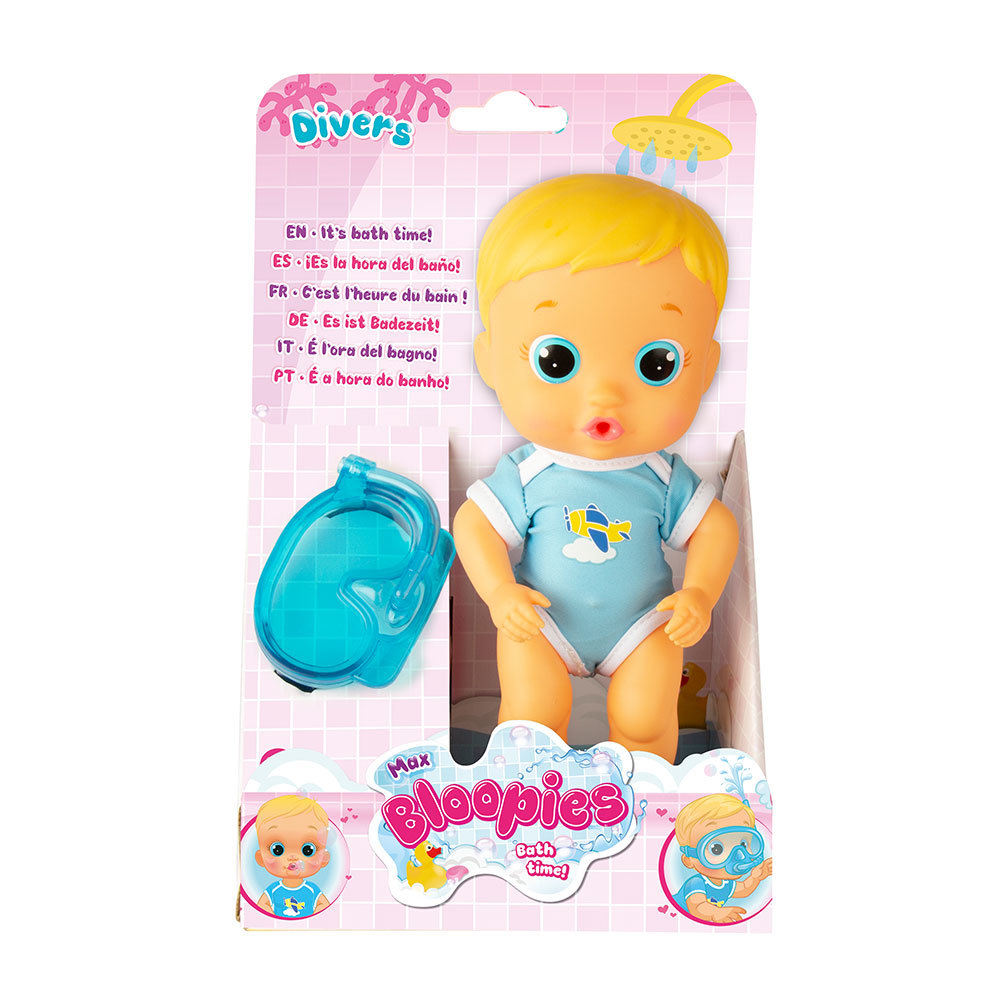 Det er tid til at svømme, og dukken Max er den perfekte badepartner! Max elsker at svømme og lege med vand. Tryk på dukkens mave for at udføre forskellige tricks. Når du trykker på maven, når dukken har snorklen på, sprøjtes der vand fra snorklen uden snorkelen, dukken kan sprøjte både vand og bobler fra munden. Børnene vil aldrig stoppe med at svømme!