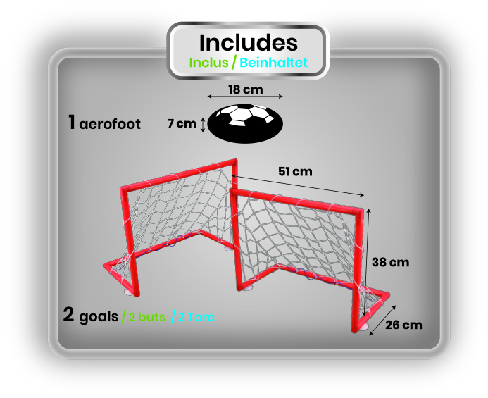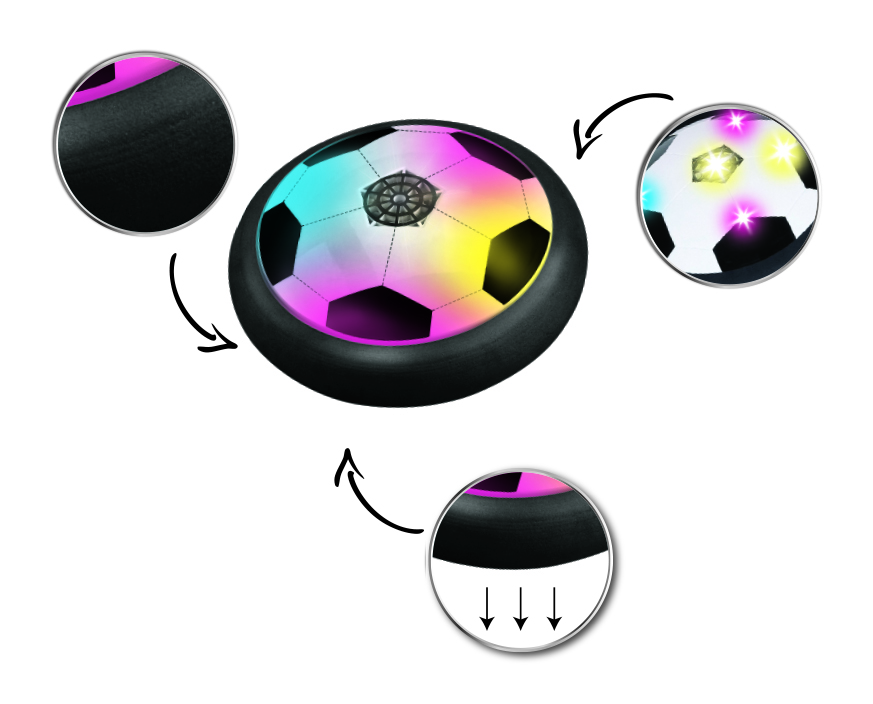 En rigtig sjovt legetøj at flåd og bounces, når den rammer en kant / væg. Bolden har lysdioder, der lyser i forskellige farver, selv i mørke. Et sjovt legetøj, der ligner Air hockey. Kan bruges som glidende fodbold / puck, med eller uden hockey klubber.