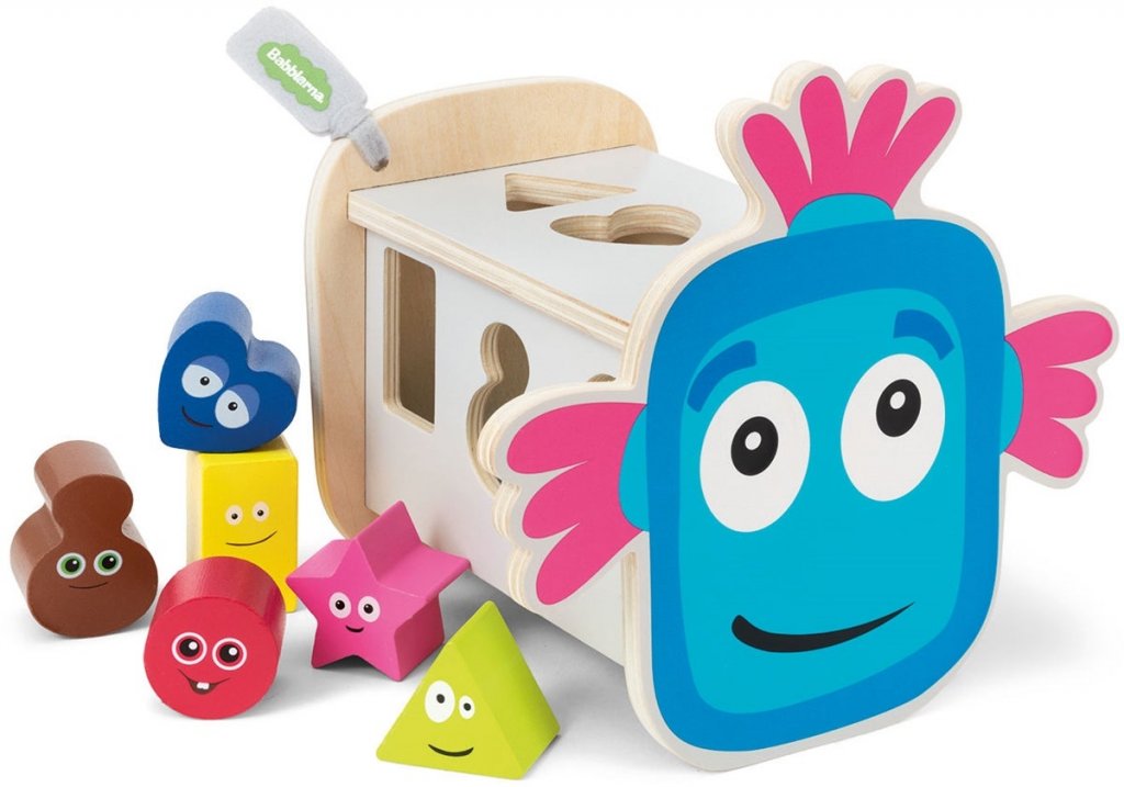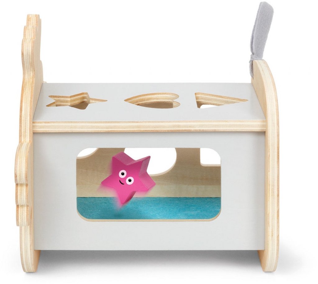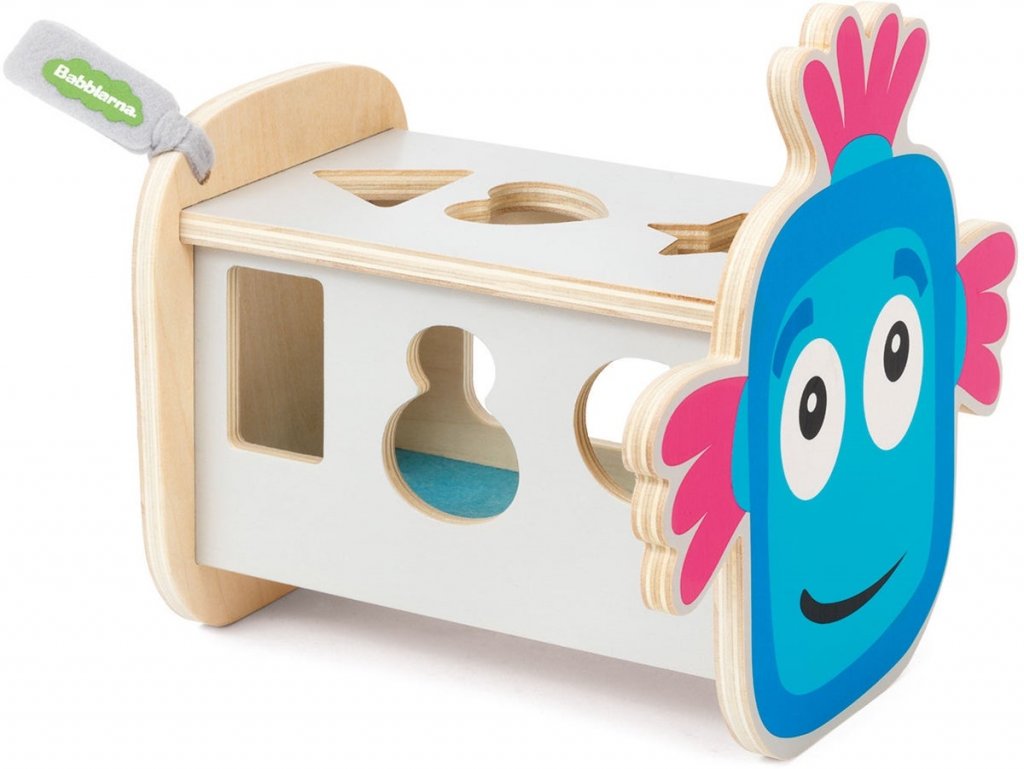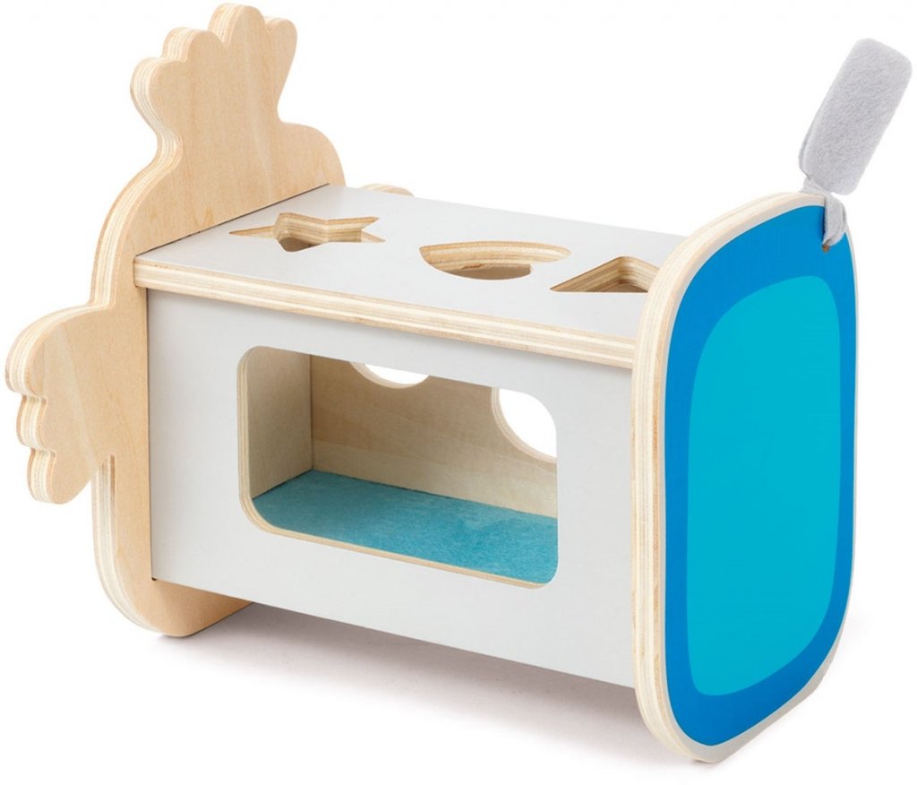øve dine fine motorik ved at matche den rigtige blokering af forskelligt formede åbninger i toppen af ​​kassen. Box bunden er dækket i filt til at dæmpe lyden, når brikkerne falder igennem.