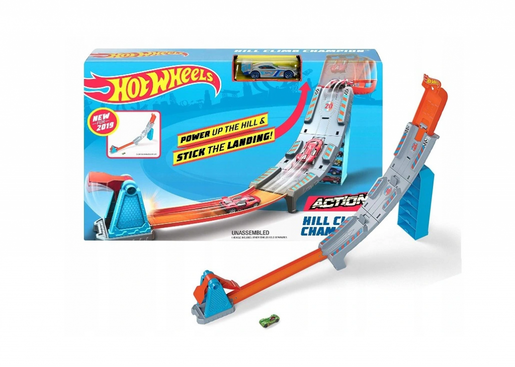 Du bliver nødt til at arbejde på hældningerne og skydeteknikkerne, hvis du vil være overlegen og den bedste. Konkurrer med dine venner og se, hvem der kan komme længst med bilen! Du kan også kombinere dette sæt med andre Hot wheels-sæt for at skabe endnu større og sværere baner!