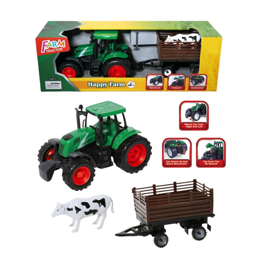 Grøn traktor med anhænger og en sød ko – perfekt til sjove bondegårdsoplevelser!