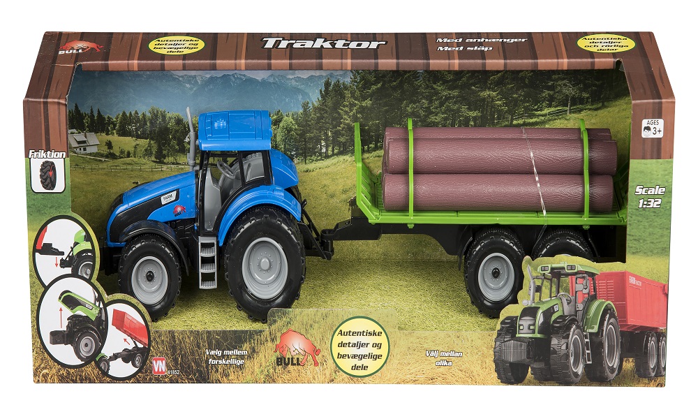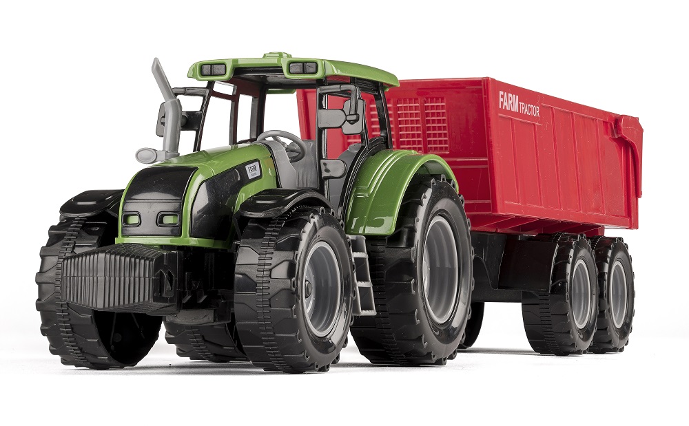 Frække legetøjstraktorer med trailer! Det perfekte legetøj til børn, der elsker biler og traktorer! Legetøjstraktoren er friktionsstyret, hvilket betyder, at hvis du trækker den langs jorden og slipper den, vil køretøjet fortsætte med at køre af sig selv et stykke tid!