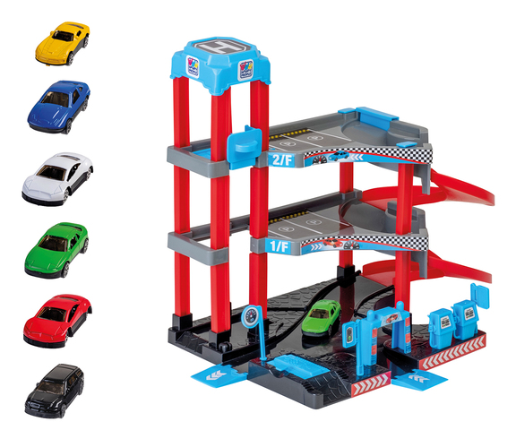 • Mange parkeringsniveauer – Giver plads til fantasifuld leg med flere parkeringsområder.