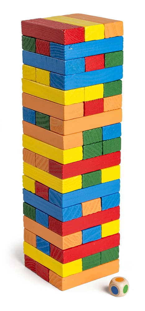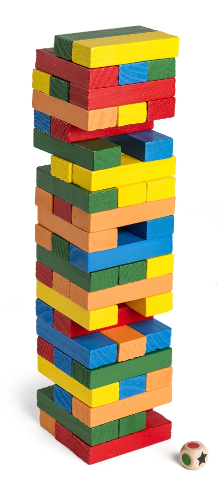 Spilleren, der byggede tårnet, starter med at kaste terningerne og fjerner derefter enhver blok i henhold til terningernes farve. du må dog ikke fjerne en blok på det øverste lag. Hvis terningerne ender på stjernen, skal du tage en blok uanset hvilken farve. Blokken placeres derefter vinkelret på det øverste lag. Du kan skubbe eller trække blokkene af, men må kun bruge én hånd. Selv for at sætte blokkene ovenpå, må kun én hånd bruges. Den næste spiller kaster terningerne og fjerner en blok af den farve, som terningerne viser, og placerer den ovenpå. Spillet fortsætter, indtil tårnet vælter. Taberen er den, der vælter tårnet, enten når blokken fjernes eller placeres ovenpå. Taberen bygger tårnet til næste runde og er selv spilleren, der starter spillet!