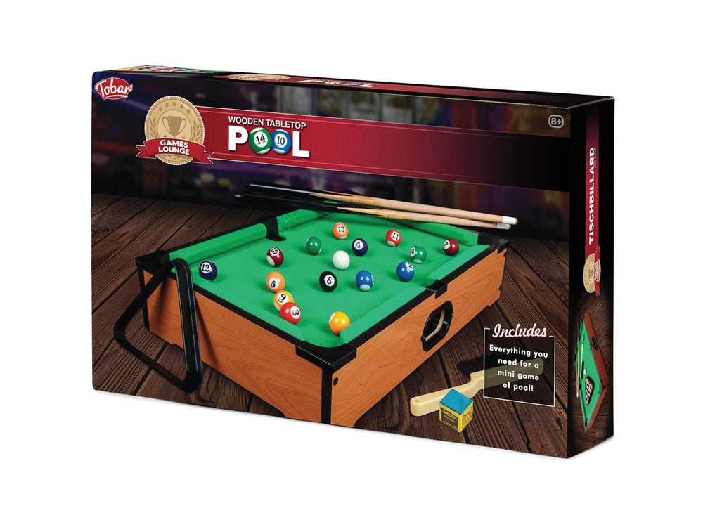 Det klassiske spil Pool i en kompakt version, der er perfekt til alle størrelser i hjemmet og kan placeres på næsten ethvert bord for at starte et spil billard. Spillets mål er identisk med den sædvanlige størrelse på billard: få alle dine billardbolde ind først og skyd i 8 før din modstander!