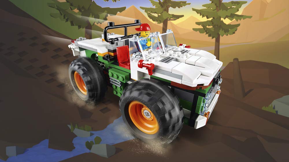 Med dette sæt kan barnet bygge 3 forskellige køretøjer, en safari jeep, en traktor med en trailer til traktortrækning eller en monster truck som et hurtigt køkken med siddepladser udenfor.