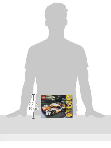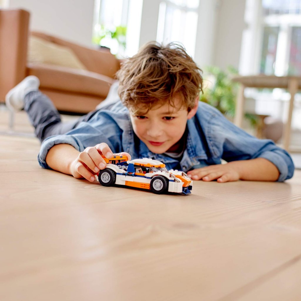 Med dette sæt kan barnet bygge tre forskellige hurtige køretøjer, en orange racerbil, en racerbåd eller en klassisk åben racerbil.