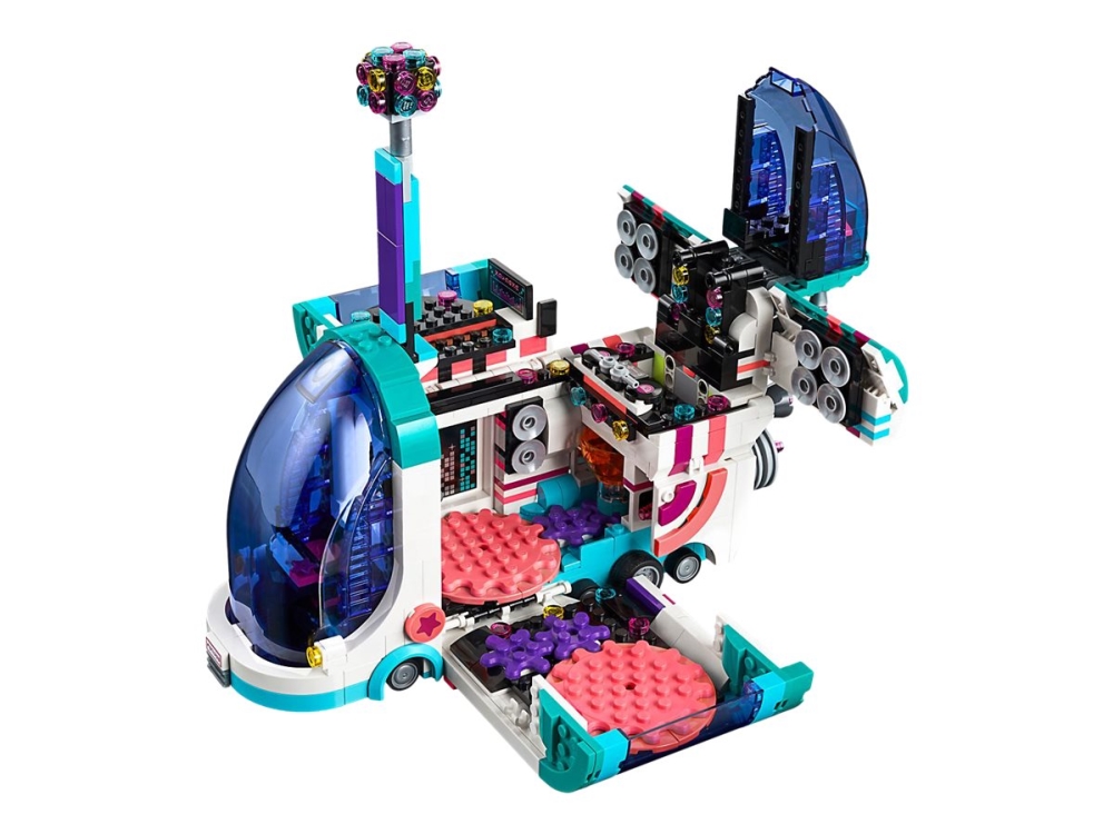 Bussen førerhus, tag og folde siderne til spille komfortabelt i ethvert hjørne af bussen. Det har også 2 pop-up-højttalere, en LEGO klods med lys, der oplyser den roterende dansegulv, en disco kugle med farverige gennemsigtige komponenter og andet tilbehør. Gør dig klar til endeløse timer af sjov med dette sæt af tegn Disco Kitty, Melody, Tempo og Zebe.