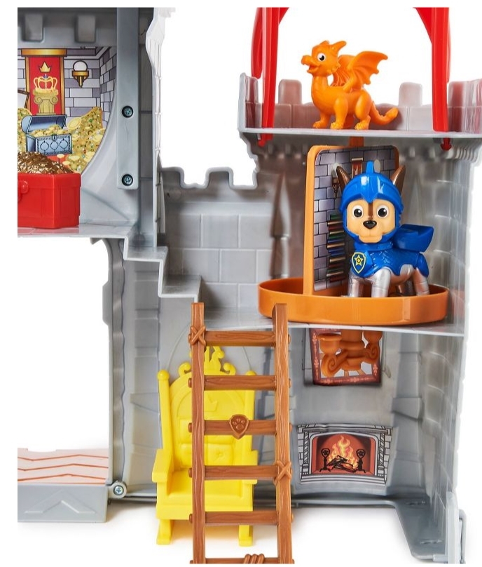 Brug udkigsposten i toppen af tårnet til at give Chase og Draco det perfekte udsigtspunkt til at se drager i problemer og til at holde øje med Dragon Sparks (ikke inkluderet)! Hæv tårnet for at gøre det til en redningstilstand, tag kanonen frem, og affyr derefter netprojektilerne (to inkluderet) for at forsvare slottet og beskytte den hemmelige skattekiste! Sænk slotsbroen for at lukke venner ind og opdage de forskellige rum i slottet, såsom det skjulte kammer i biblioteket, falddøren i korridoren og endda en hemmelig passage for at undslippe fangehullet!