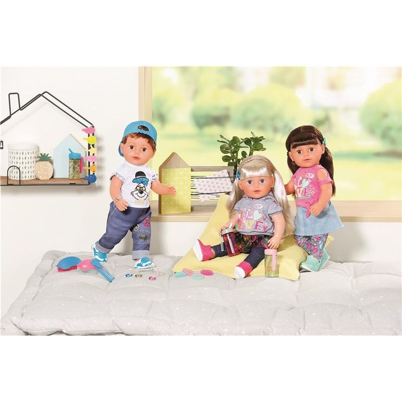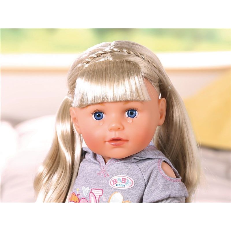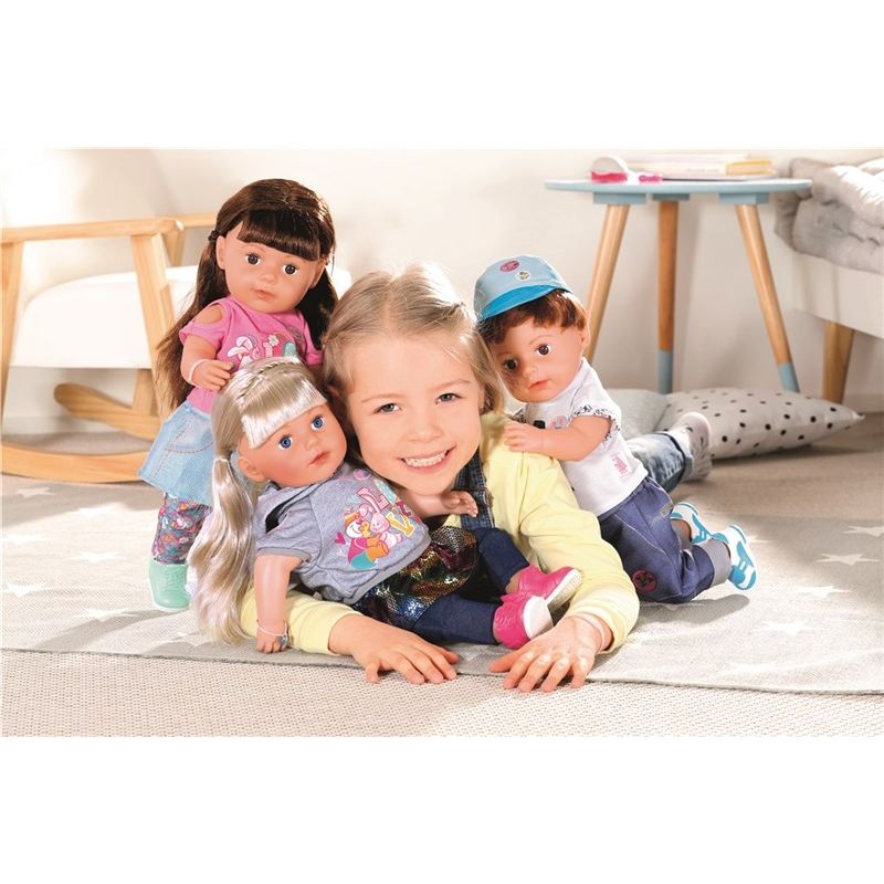 Baby Born søster har langt blond hår, kan du børste og stil og iført en hættetrøje, en nederdel og leggings i denim. De matchende sko fuldender hendes udseende. Baby Born Interactive søster har den samme størrelse som den klassiske dukke, så de kan bruge det samme tøj.