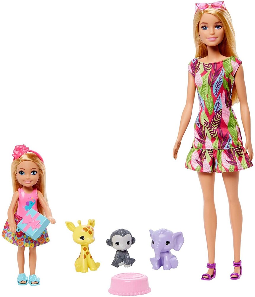 Chelseas fødselsdag og for at fejre der er både Barbie og de små dyr giraf, abe og elefant. Det er tid for dig at arrangere en jungelfest til Chelseas fødselsdag! Sættet inkluderer også en kage og en fødselsdagsgave.