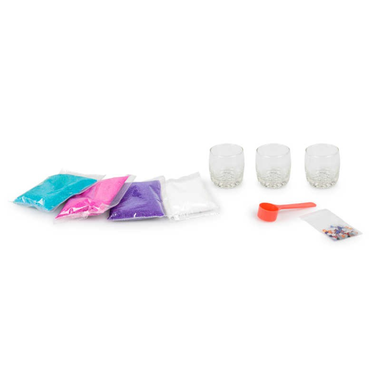 Sættet indeholder 4x poser fyldt med små vokskugler i fire forskellige farver pink, lilla, blå, hvid, 4x glasbeholdere, lim, smykker, scoop, brænder.
