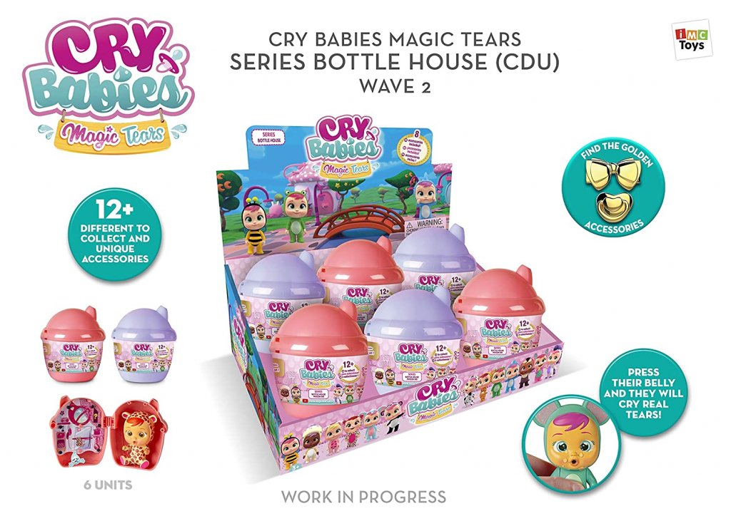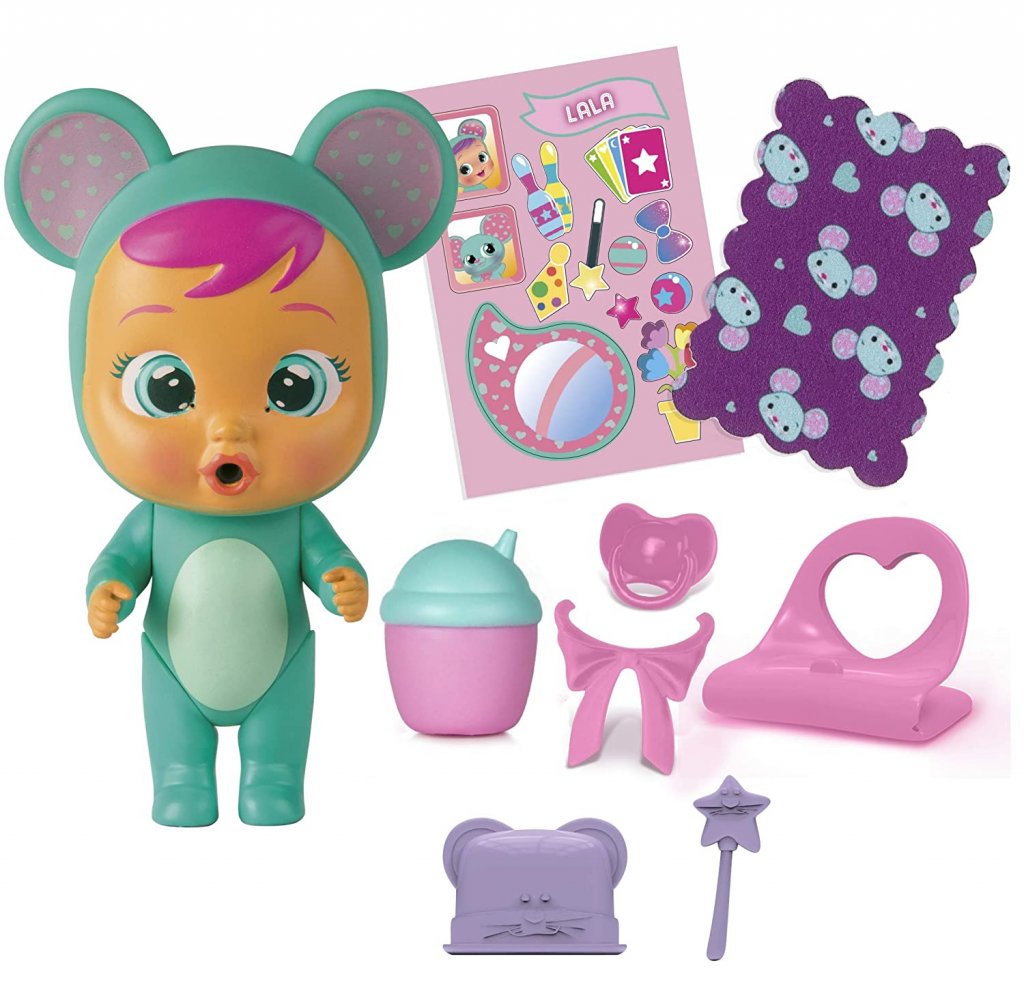De er de sødeste små børn og kommer med 8 sjove tilbehør: en flaske, en hagesmæk, en sløjfe, en lækker slikkepind, en sut, tæppe, klistermærker og en stol! Spil med dine Cry Baby Magic Tears og læg dem ned i stolen, tag på haklappen, giv dem vand fra flasken og tryk på din mave for at få dem til at græde rigtige tårer!