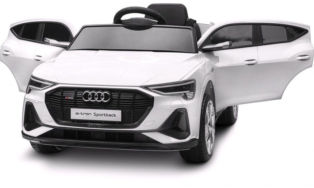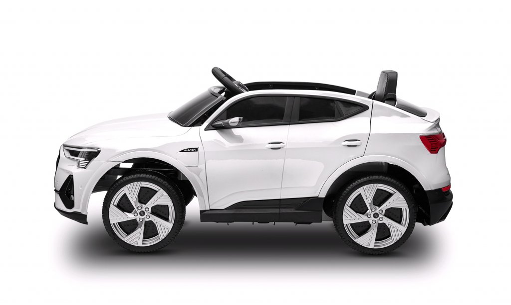 Frække og sej elbil Audi E Tron med hvidt stilrent design. Styr bilen med fjernbetjening, barnet kan sidde i bilen mens den voksne styrer bilen. Elbilen har eksklusive gummidæk til roligere og mere jævn kørsel samt lyd- og lysfunktioner, glem ikke at tænde lyset om aftenen. Bilen har desuden sidespejle og oplukkelige døre.