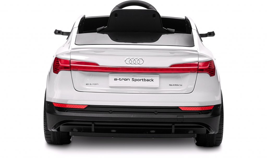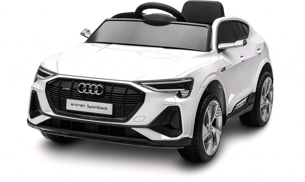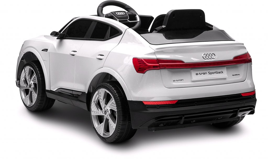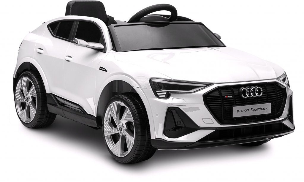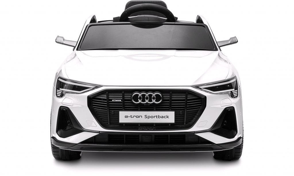 Frække og sej elbil Audi E Tron med hvidt stilrent design. Styr bilen med fjernbetjening, barnet kan sidde i bilen mens den voksne styrer bilen. Elbilen har eksklusive gummidæk til roligere og mere jævn kørsel samt lyd- og lysfunktioner, glem ikke at tænde lyset om aftenen. Bilen har desuden sidespejle og oplukkelige døre.