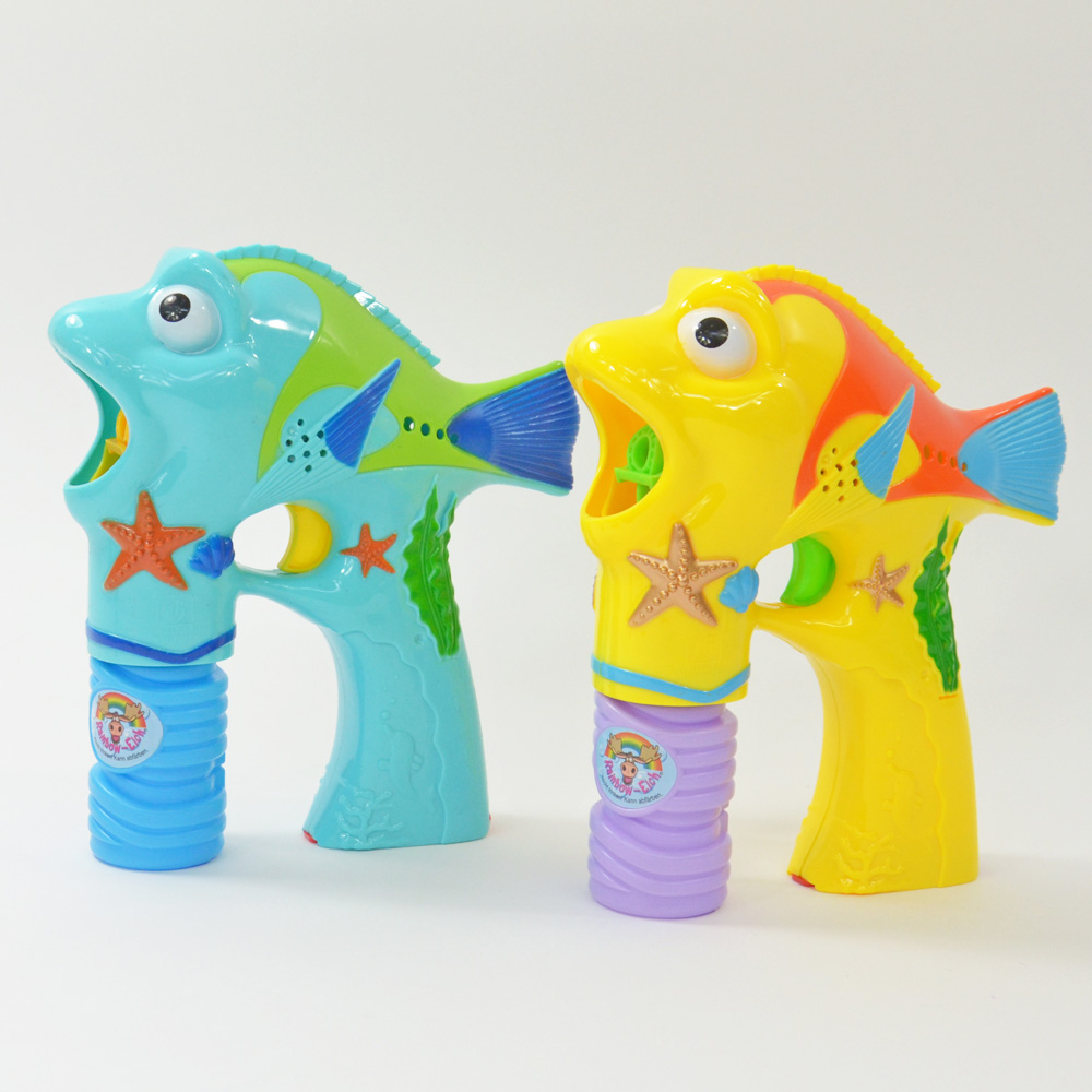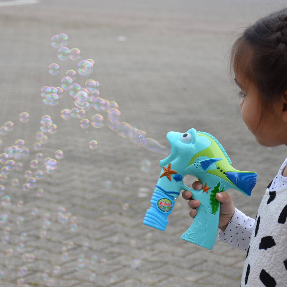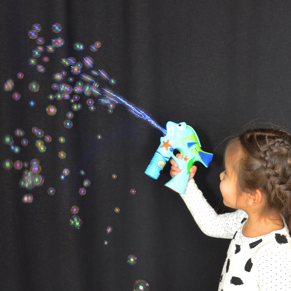 Såpbubbel pistol tændt og boblende ud masser af sæbebobler. 1 flaske fyldt med sæbebobler indbefattet som skrue pistolen. Kan være fyldt med almindelig sæbe boble flydende.