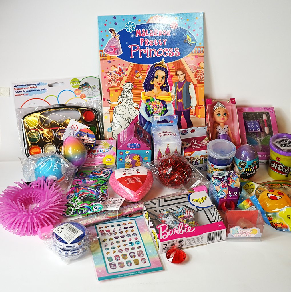 I pakken finder du f.eks. Barbie-tøj, Frost-figur, Disney-prinsesse, voksende enhjørningæg, Gurli Gris-figur, Play Doh-ler, slim, squishy, My Little Pony-ring, makeupsæt og meget mere!