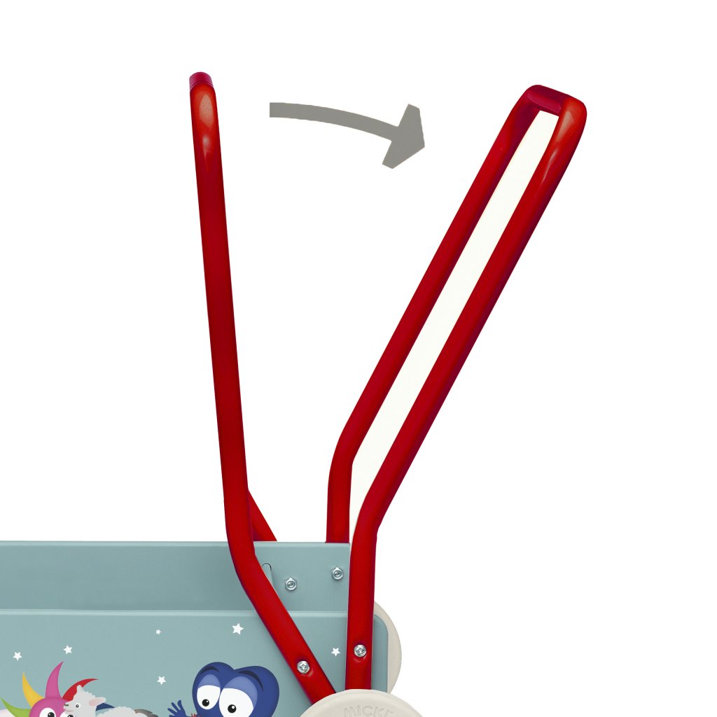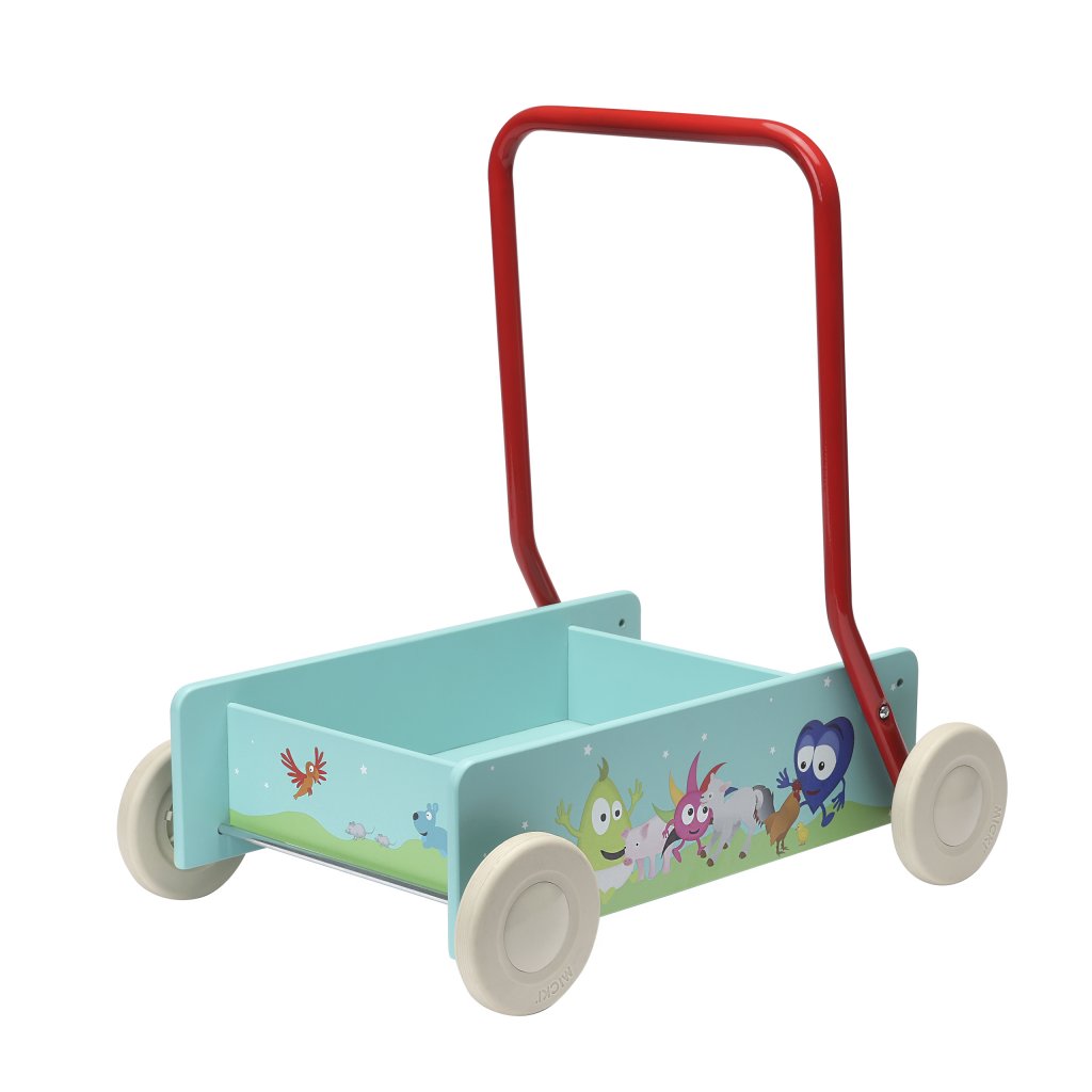 Vognen giver stabil og sikker støtte, når barnet tager sine første skridt. Den har låsbare hjul og justerbart håndtag. Når barnet har lært at gå, kan håndtaget justeres, så vognen bliver til en sjov legevogn i mange år. Måske skal klodserne køres et sted hen, eller måske vil Vovvo og Faffa med på en tur? Lad legen vise vejen på rejsen!