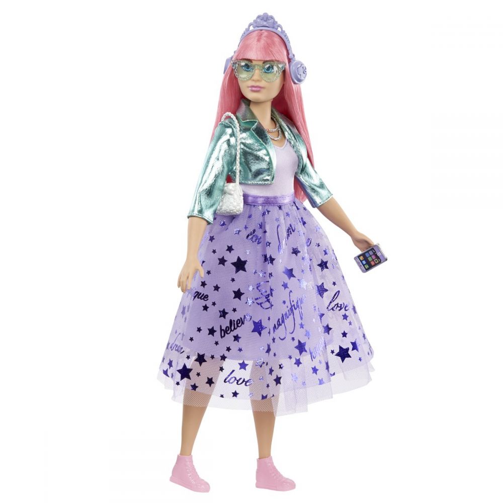 Princess Adventure Barbie dukke med tilbehør, tøj og tilbehør. Dukken har et moderne tøj, har en smuk skinnende tylkjole med stjerner, en hård jakke i metallisk farve, tiara og sko.