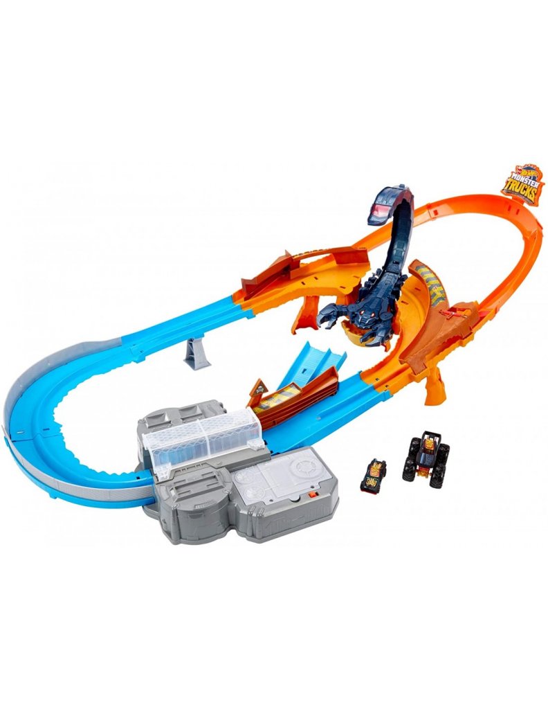 Hot Wheels Monster Track Scorpion Sting raceway kids sæt er en klassisk racer konkurrence med en stor skorpion, der ikke er bange for de hurtige biler. Træk håndtaget op, og slip det for at starte nedtællingen. Når portene åbnes, er det vigtigt først at besejre skorpionen!