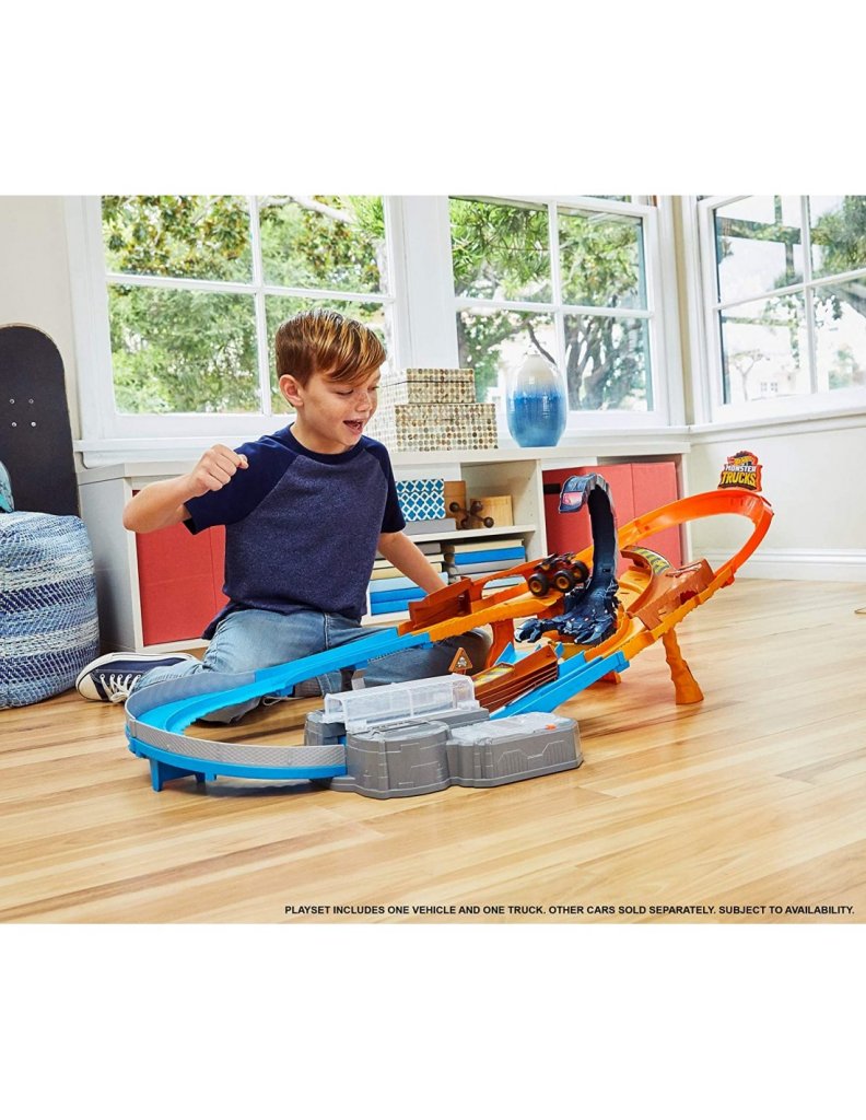 Børn kan konkurrere mod venner med Hot Wheels Monster Track Scorpion Sting-racerbanen med optimal, præstationsbaseret racing, glidning og stunt-action!