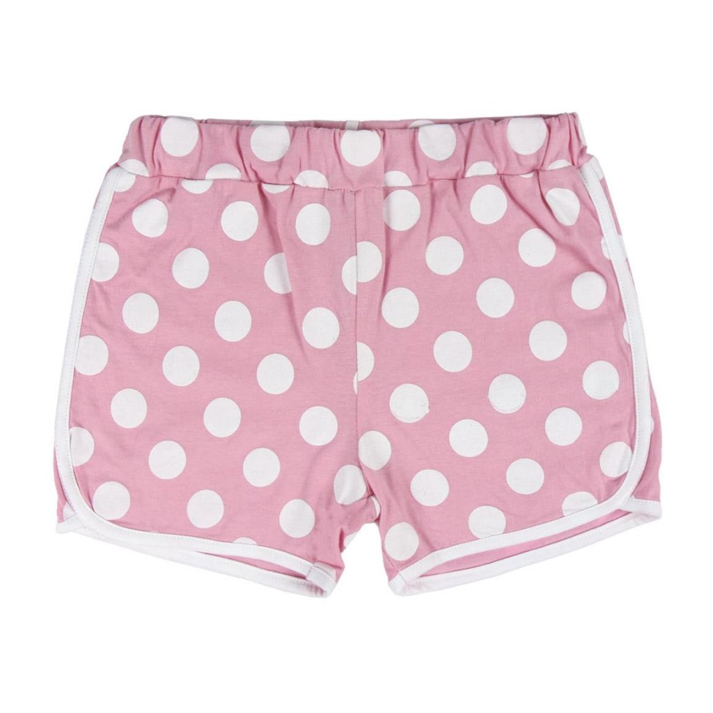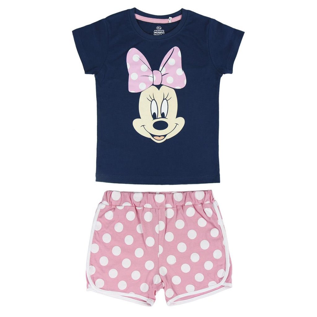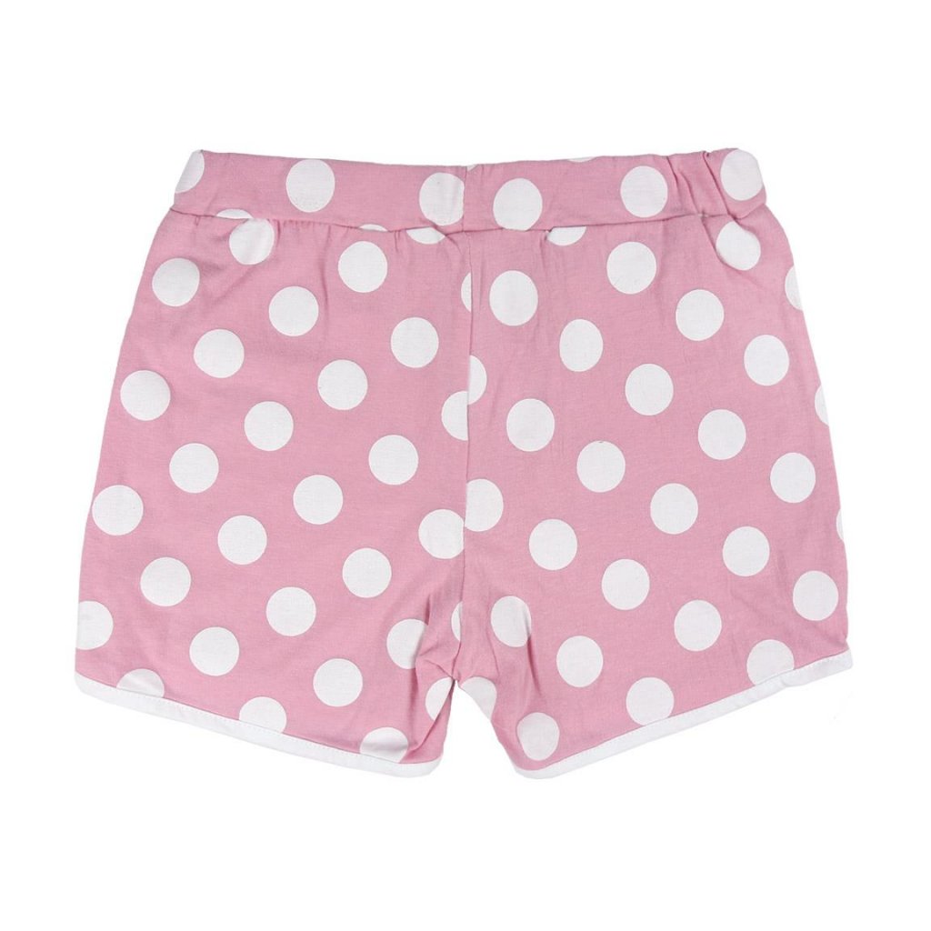 Køb Minnie Mouse shorts og kortærmet t-shirt, der også kan bruges som pyjamas. T-shirten er afbilledet med Minnie Mouse ansigt og en lyserød sløjfe, de shorts i pink med hvide prikker.