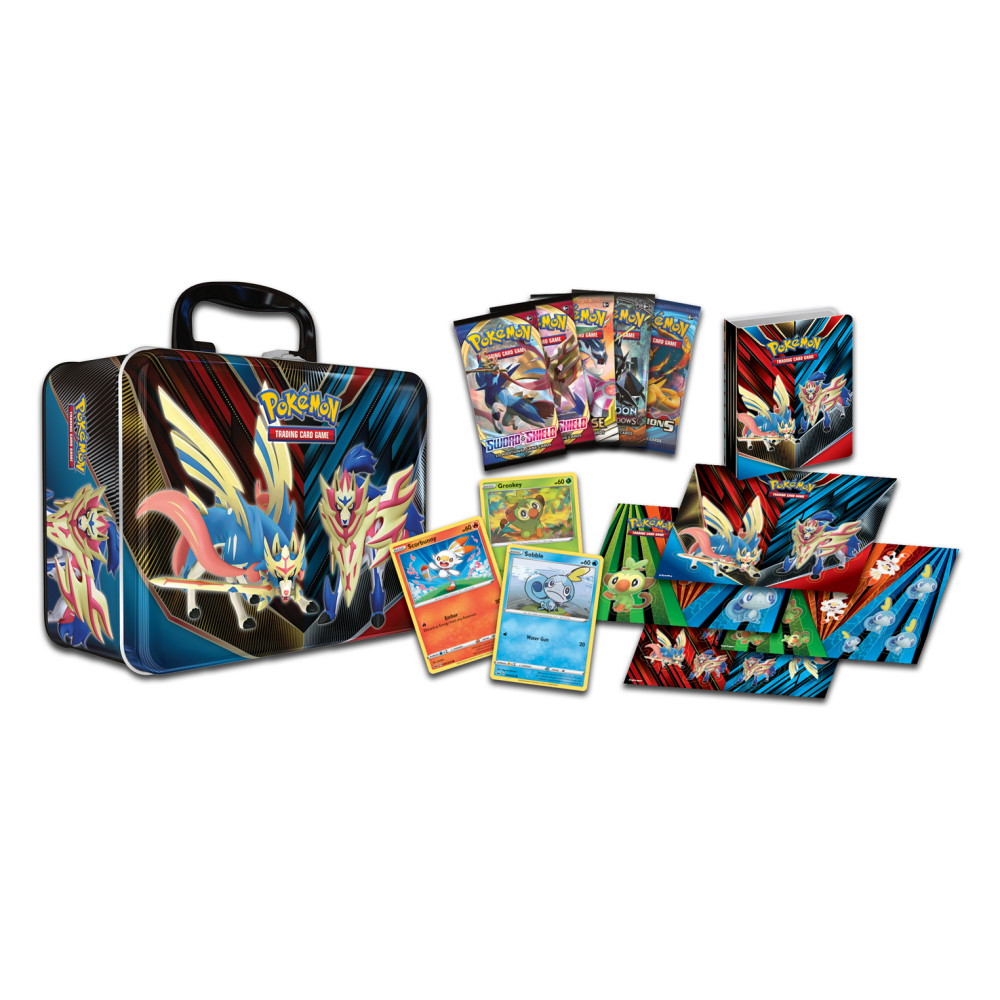 En metal tilfældet med Pokémon motiver af de tegn Zacian og Zamazenta. Hvis der er promo kort på Grookey, Scorbunny og Sobble, 1 m Pokemon mønter, 4 klistermærker, 1 stk notebook, 1 st album samler kortene, 2 Sword & amp; Shield Booster, 1 m Cosmic Eclipse Booster pakker, 1 m Evolution Booster pakker og 1 Burning Shadown Booster pakker
